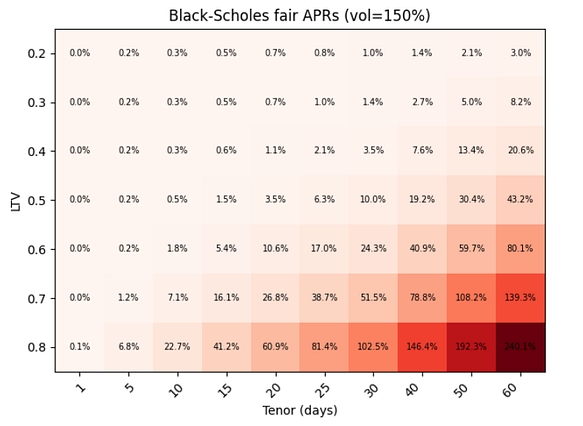 The Black-Scholes-derived fair APRs do increase for higher LTVs and longer tenors, which intuitively also makes sense, as LPs bear more risk and hence expect to receive a higher APR to be compensated for this.